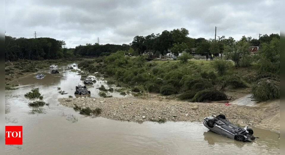 Vehicles sit in the river after being swept away by floodwaters in San Antonio (Image credit: AFP)