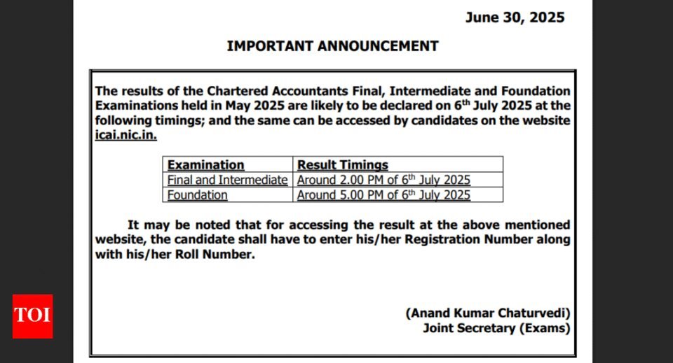 “The results of the Chartered Accountants Final, Intermediate and Foundation Examinations held in May 2025 are likely to be declared on 6th July 2025 at the following timings; and the same can be accessed by candidates on the website icai.nic.in,” the institute stated in its official release.